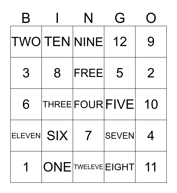 This bingo card has a free space and 24 words: SIX, ONE, FREE, 1, 9, TWO, 3, TEN, FIVE, 7, 5, 6, SEVEN, 4, 8, EIGHT, 10, NINE, 2, THREE, 11, ELEVEN, 12 and TWELEVE.