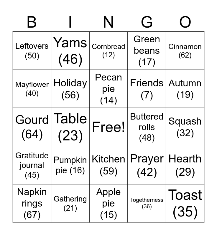 This bingo card has a free space and 24 words: Pumpkin pie (16), Gathering (21), Pecan pie (14), Napkin rings (67), Cinnamon (62), Leftovers (50), Mayflower (40), Yams (46), Buttered rolls (48), Kitchen (59), Friends (7), Gourd (64), Prayer (42), Hearth (29), Holiday (56), Togetherness (36), Squash (32), Cornbread (12), Autumn (19), Table (23), Toast (35), Gratitude journal (45), Green beans (17) and Apple pie (15).