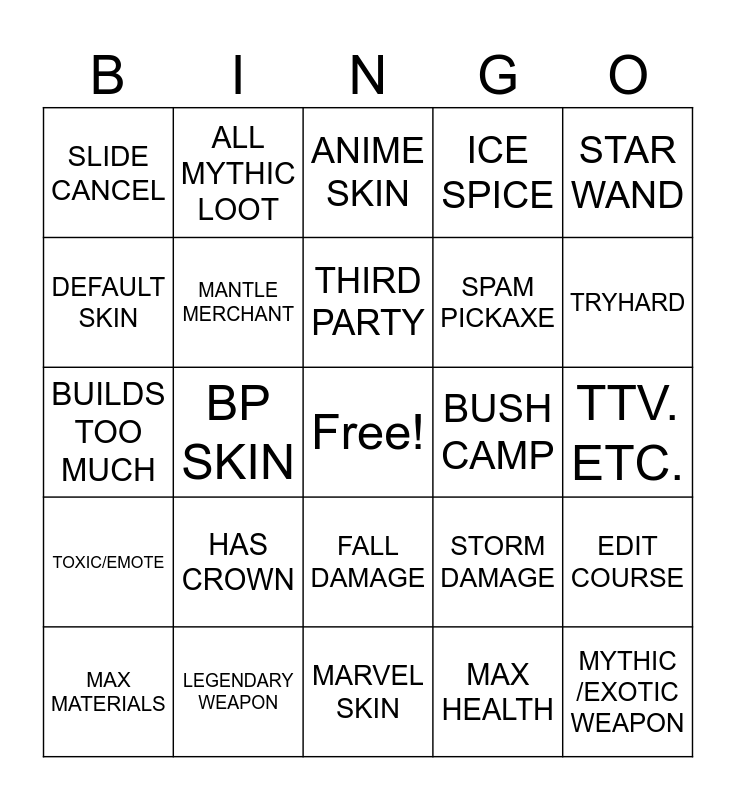 This bingo card has a free space and 29 words: MAX MATERIALS, DOESNT BUILD, BP SKIN, NO KILLS, SLIDE CANCEL, ANIME SKIN, MANTLE MERCHANT, HAS CROWN, BUSH CAMP, LEGENDARY WEAPON, TTV. ETC., MYTHIC /EXOTIC WEAPON, MARVEL SKIN, MAX HEALTH, TRYHARD, DRIVES CAR, FALL DAMAGE, TOXIC/EMOTE, STAR WAND, BUILDS TOO MUCH, STORM DAMAGE, 5+ KILLS, SPAM PICKAXE, DEFAULT SKIN, ICE SPICE, ALL MYTHIC LOOT, EDIT COURSE, THIRD PARTY and CAMPING.
