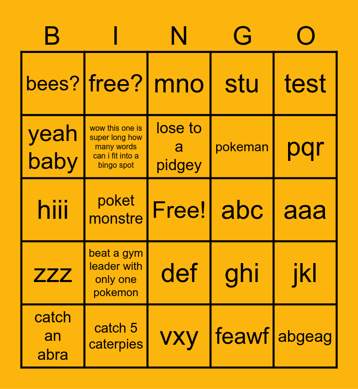 This bingo card has a free space and 24 words: beat a gym leader with only one pokemon, catch 5 caterpies, lose to a pidgey, catch an abra, test, bees?, yeah baby, free?, abc, def, pokeman, hiii, ghi, jkl, wow this one is super long how many words can i fit into a bingo spot, feawf, aaa, mno, pqr, poket monstre, abgeag, zzz, stu and vxy.