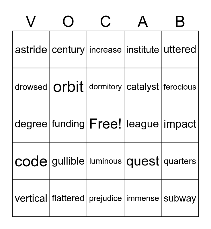 This bingo card has a free space and 24 words: gullible, flattered, dormitory, vertical, uttered, astride, drowsed, century, league, luminous, catalyst, degree, quest, quarters, orbit, immense, impact, increase, ferocious, funding, subway, code, institute and prejudice.