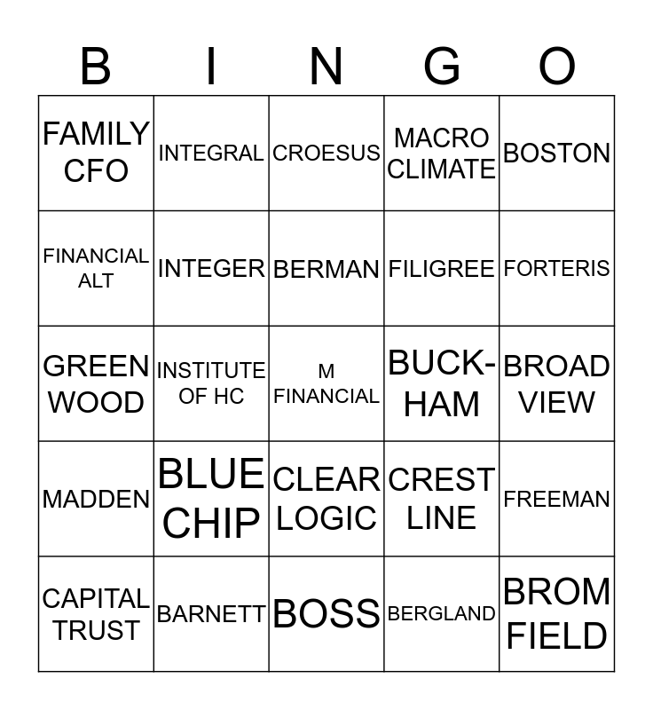 This bingo card has a free space and 24 words: BLUE CHIP, BARNETT, BERMAN, CAPITAL TRUST, BOSTON, FAMILY CFO, FINANCIAL ALT, INTEGRAL, BUCK-HAM, CLEAR LOGIC, FILIGREE, GREEN WOOD, CREST LINE, FREEMAN, INTEGER, BERGLAND, BROAD VIEW, CROESUS, FORTERIS, INSTITUTE OF HC, BROM FIELD, MADDEN, MACRO CLIMATE and BOSS.