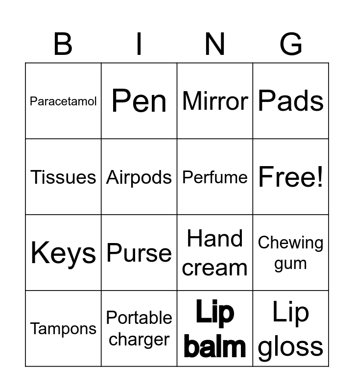 This bingo card has 17 words: Lip balm, Tampons, Mirror, Paracetamol, Purse, Pads, Chewing gum, Perfume, Free!, Airpods, Portable charger, Hand cream, Tissues, Pen, Keys, Cheeky snack and Lip gloss.