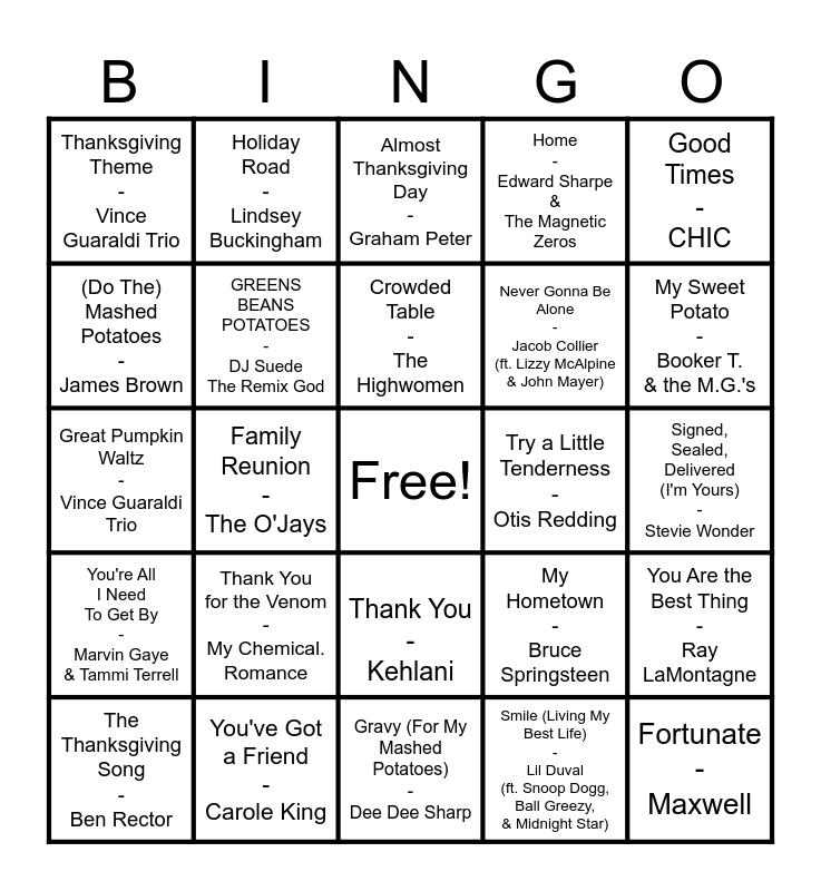 This bingo card has a free space and 75 words: Ain't Too Proud To Beg - The Temptations, All That Meat And No Potatoes - Louis Armstrong, Almost Thanksgiving Day - Graham Peter, Apples, Peaches, Pumpkin Pie - Jay & The Techniques, Autumn In New York - Billie Holiday, Autumn Leaves - Chet Baker, Be Thankful - Natalie Cole, Better Together - Jack Johnson, Biscuits - Kacey Musgraves, Chicken Grease - D'Angelo, Color of Autumn - Nujabes, Come Together - The Beatles, Crowded Table - The Highwomen, (Do The) Mashed Potatoes - James Brown, Everybody Eats When They Come To My House - Cab Calloway, Family Reunion - The O'Jays, Happiness - The Foreign Exchange, Fortunate - Maxwell, Golden - Jill Scott, Good Times - CHIC, Gratitude - Earth, Wind & Fire, Great Pumpkin Waltz - Vince Guaraldi Trio, GREENS BEANS POTATOES - DJ Suede The Remix God, Holiday Road - Lindsey Buckingham, Home - Edward Sharpe & The Magnetic Zeros, How Sweet It Is (To Be Loved By You) - James Tayor, Humble And Kind - Tim McGraw, I Found My Smile Again - D'Angelo, I've Got Plenty To Be Thankful For - Bing Crosby, I Wanna Thank Ya - Angie Stone (ft. Snoop Dogg), Let's Turkey Trot - Little Eva, Lovely Day - Bill Withers, Macy's Day Parade - Green Day, My Hometown - Bruce Springsteen, My Sweet Potato - Booker T. & the M.G.'s, Never Gonna Be Alone - Jacob Collier (ft. Lizzy McAlpine & John Mayer), November Has Come - Gorillaz (ft. MF DOOM), Santa Stole Thanksgiving - Jimmy Buffett, Signed, Sealed, Delivered (I'm Yours) - Stevie Wonder, Smile (Living My Best Life) - Lil Duval (ft. Snoop Dogg, Ball Greezy, & Midnight Star), So Amazing - Luther Vandross, Stretchy Pants - Carrie Underwood, Sweet Potato Pie - Ray Charles (ft. James Taylor), Take Me Home, Country Roads - John Denver, Thankful - Kelly Clarkson, Thank Me Now - Drake, The Thanksgiving Song - Ben Rector, Thanksgiving Theme - Vince Guaraldi Trio, The Thanks I Get - Wilco, thank u, next - Ariana Grande, Thank You - Dido, Thank You - Kehlani, Thank You - Busta Rhymes (ft. Q-Tip, Kanye West, & Lil Wayne), Thank You - MKTO, Thank You - JAY-Z, Thank You - Clairo, Thank You (Falettinme Be Mice Elf Agin) - Sly & The Family Stone, Thank You - Nujabes (ft. Apani B), Thank You For Being a Friend - Andrew Gold, Thank You For The Music - ABBA, Thank You for the Venom - My Chemical. Romance, That's What Friends Are For - Dionne Warwick (ft. Elton John, Gladys Knight, & Stevie Wonder), This Will Be (An Everlasting Love) - Natalie Cole, Thanks fr th Mmrs - Fall Out Boy, Together Again - Janet Jackson, Try a Little Tenderness - Otis Redding, Collard Greens - ScHoolboy Q (ft. Kendrick Lamar), Turkey Lurkey Time - Burt Bacharach, We Are Family - Sister Sledge, You Are the Best Thing - Ray LaMontagne, You're All I Need To Get By - Marvin Gaye & Tammi Terrell, You've Got a Friend - Carole King, I Say a Little Prayer - Aretha Franklin, Gravy (For My Mashed Potatoes) - Dee Dee Sharp and Veg Out (Wasting Thyme) - Masego.
