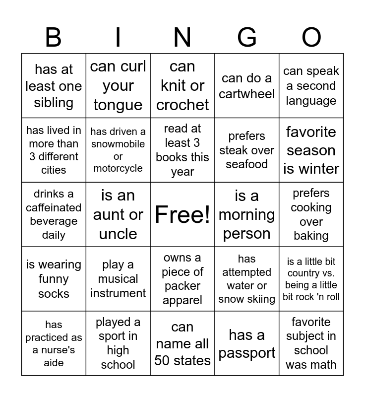 This bingo card has a free space and 24 words: play a musical instrument, played a sport in high school, read at least 3 books this year, has practiced as a nurse's aide, can speak a second language, has at least one sibling, has lived in more than 3 different cities, can curl your tongue, is a morning person, owns a piece of packer apparel, prefers steak over seafood, drinks a caffeinated beverage daily, has attempted water or snow skiing, is a little bit country vs. being a little bit rock 'n roll, has driven a snowmobile or motorcycle, has a passport, prefers cooking over baking, can knit or crochet, favorite season is winter, is an aunt or uncle, favorite subject in school was math, is wearing funny socks, can do a cartwheel and can name all 50 states.