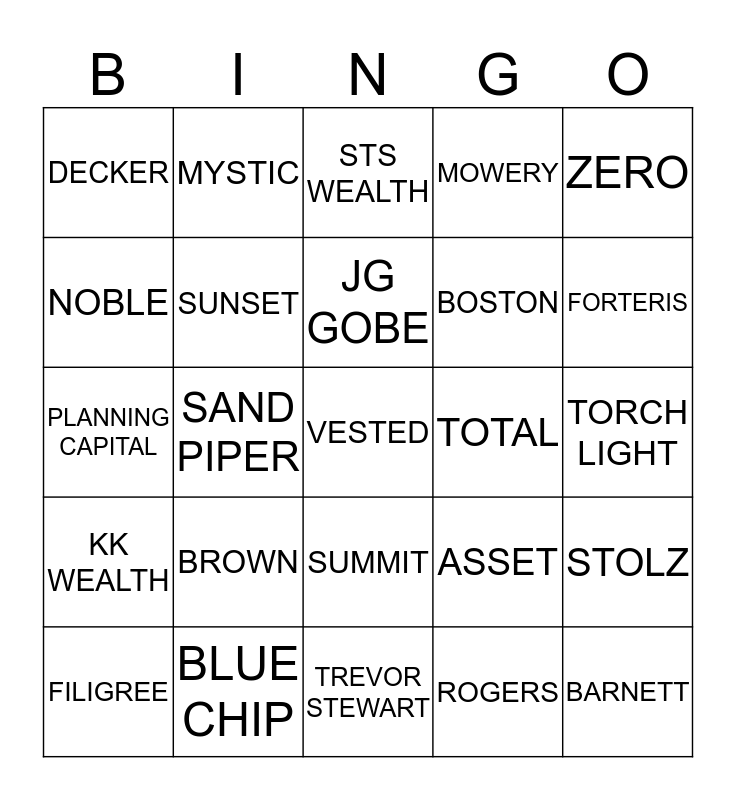 This bingo card has a free space and 24 words: BROWN, BLUE CHIP, JG GOBE, FILIGREE, ZERO, DECKER, NOBLE, MYSTIC, TOTAL, SUMMIT, BOSTON, PLANNING CAPITAL, ASSET, STOLZ, SUNSET, ROGERS, TORCH LIGHT, STS WEALTH, FORTERIS, SAND PIPER, BARNETT, KK WEALTH, MOWERY and TREVOR STEWART.