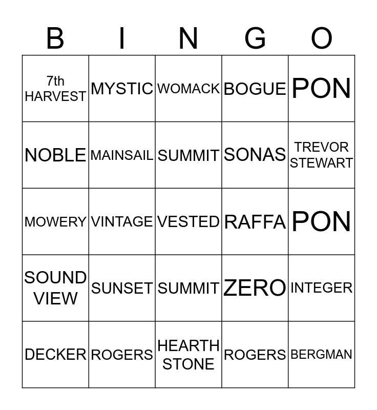 This bingo card has a free space and 24 words: SUNSET, ROGERS, SUMMIT, DECKER, PON, 7th HARVEST, NOBLE, MYSTIC, RAFFA, SUMMIT, SONAS, MOWERY, ZERO, INTEGER, MAINSAIL, ROGERS, PON, WOMACK, TREVOR STEWART, VINTAGE, BERGMAN, SOUND VIEW, BOGUE and HEARTH STONE.