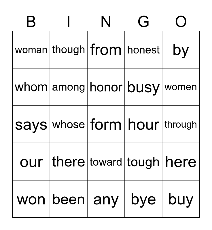This bingo card has 25 words: there, any, honor, won, by, woman, whom, though, hour, toward, busy, says, tough, here, among, buy, through, from, women, whose, form, been, our, honest and bye.