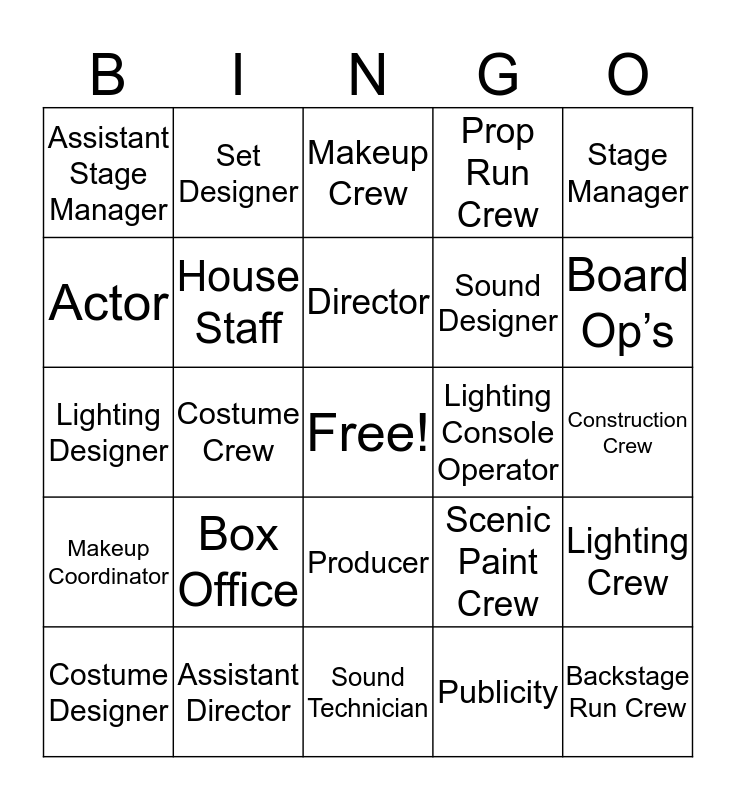 This bingo card has a free space and 26 words: Producer, Publicity, Director, Assistant Director, Stage Manager, Assistant Stage Manager, Actor, Set Designer, Construction Crew, Scenic Paint Crew, Sound Designer, Lighting Designer, Lighting Crew, Costume Designer, Costume Crew, Prop Designer, Prop Run Crew, Makeup Coordinator, Makeup Crew, Backstage Run Crew, Board Op’s, Sound Technician, Lighting Console Operator, Box Office, House Staff and House Manager.