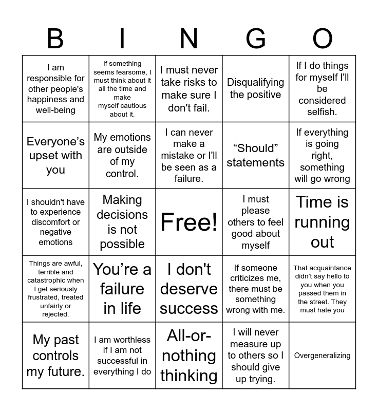 This bingo card has a free space and 34 words: Other people must always treat me fairly and kindly., I will never measure up to others so I should give up trying., It's easier to avoid problems then to deal with them., It is easier to avoid or run away from many life difficulties and responsibilities rather than to be self-disciplined., Things are awful, terrible and catastrophic when I get seriously frustrated, treated unfairly or rejected., My emotions are outside of my control., If I do things for myself I'll be considered selfish., My past controls my future., If something seems fearsome, I must think about it all the time and make myself cautious about it., My worth as a person is based on external factors such as appearance or achievements., I can never make a mistake or I'll be seen as a failure., I must never take risks to make sure I don't fail., If I don't do everything perfectly, I will be rejected or abandoned, If something bad happens, it means everything is going to be terrible from now on, I must please others to feel good about myself, If everything is going right, something will go wrong, I am worthless if I am not successful in everything I do, I shouldn't have to experience discomfort or negative emotions, You’re a failure in life, If someone criticizes me, there must be something wrong with me., I don't deserve success, I must always be liked and accepted by everyone.", I am responsible for other people's happiness and well-being, Time is running out, All-or-nothing thinking, Overgeneralizing, Disqualifying the positive, Personalization or excessive responsibility, “Should” statements, Everyone’s upset with you, You don’t think you’ll ever be able to come out of this anxious state, Making decisions is not possible, That acquaintance didn’t say hello to you when you passed them in the street. They must hate you and You remember all the embarrassing mistakes you’ve ever made.