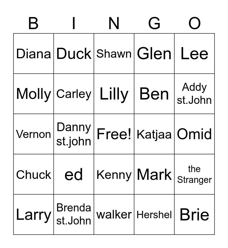 This bingo card has a free space and 24 words: ed, Brenda st.John, Lilly, Larry, Lee, Diana, Molly, Duck, Katjaa, Kenny, Ben, Vernon, Mark, the Stranger, Carley, Hershel, Omid, Shawn, Addy st.John, Danny st.john, Brie, Chuck, Glen and walker.