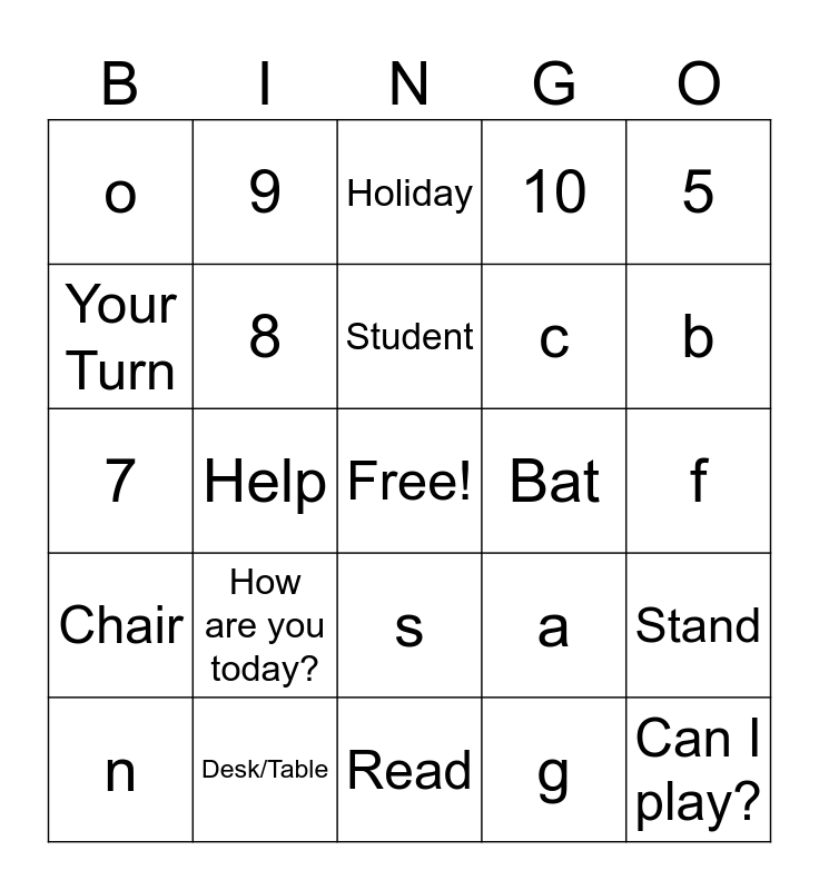 This bingo card has a free space and 77 words: Happy Thanksgiving, Turkey, Holiday, Winter, Santa, Snow, Jingle Bells, 1, 2, 3, Class, Teacher, Student, Your Turn, Interpreter, Help, Colors, Can I play?, 4, 5, 6, 7, 8, 9, 10, Red, Orange, Yellow, Green, Blue, Purple, Black, Gray, a, b, c, d, e, f, g, h, i, j, k, l, m, n, o, p, q, r, s, t, u, v, w, x, y, z, Good Morning, How are you today?, Slow, Again, Understand, Don’t Understand, Happy Halloween, Trick or Treat, Bat, Line Up, Out, Sit, Stand, Chair, Desk/Table, Folder, Read and Book.