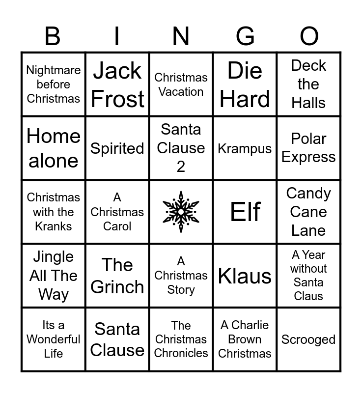 This bingo card has a free space and 24 words: The Grinch, Santa Clause, Santa Clause 2, Its a Wonderful Life, Deck the Halls, Nightmare before Christmas, Home alone, Jack Frost, Elf, A Christmas Story, Krampus, Christmas with the Kranks, Klaus, A Year without Santa Claus, Spirited, A Charlie Brown Christmas, Candy Cane Lane, Christmas Vacation, Polar Express, A Christmas Carol, Scrooged, Jingle All The Way, Die Hard and The Christmas Chronicles.