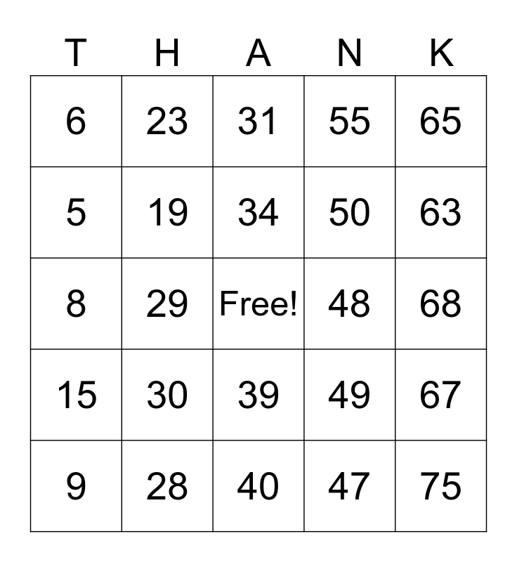 This bingo card has a free space and 75 words: 1, 16, 31, 46, 61, 2, 17, 32, 47, 62, 3, 18, 48, 63, 4, 19, 33, 49, 64, 5, 20, 34, 50, 65, 6, 21, 35, 51, 66, 7, 22, 36, 52, 67, 8, 23, 37, 53, 68, 9, 24, 38, 54, 69, 10, 25, 39, 55, 70, 11, 26, 40, 56, 71, 12, 27, 41, 57, 72, 13, 28, 42, 58, 73, 14, 29, 43, 59, 74, 15, 30, 44, 60, 75 and 45.