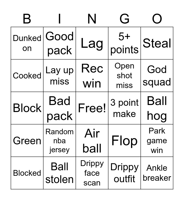 This bingo card has a free space and 24 words: Random nba jersey, Ball stolen, Rec win, Blocked, Steal, Dunked on, Cooked, Good pack, 3 point make, Air ball, Open shot miss, Block, Flop, Park game win, Lay up miss, Drippy outfit, Ball hog, Lag, God squad, Bad pack, Ankle breaker, Green, 5+ points and Drippy face scan.