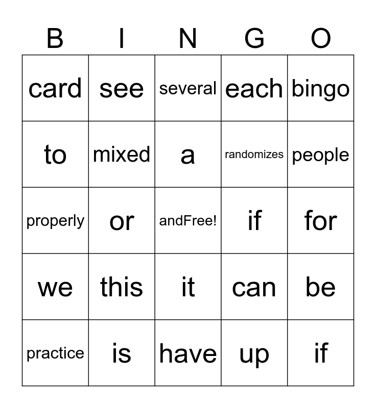 This bingo card has a free space and 24 words: this, is, a, practice, bingo, card, to, see, if, it, randomizes, properly, can, be, mixed, up, for, several, people, or, if, we, each and have.