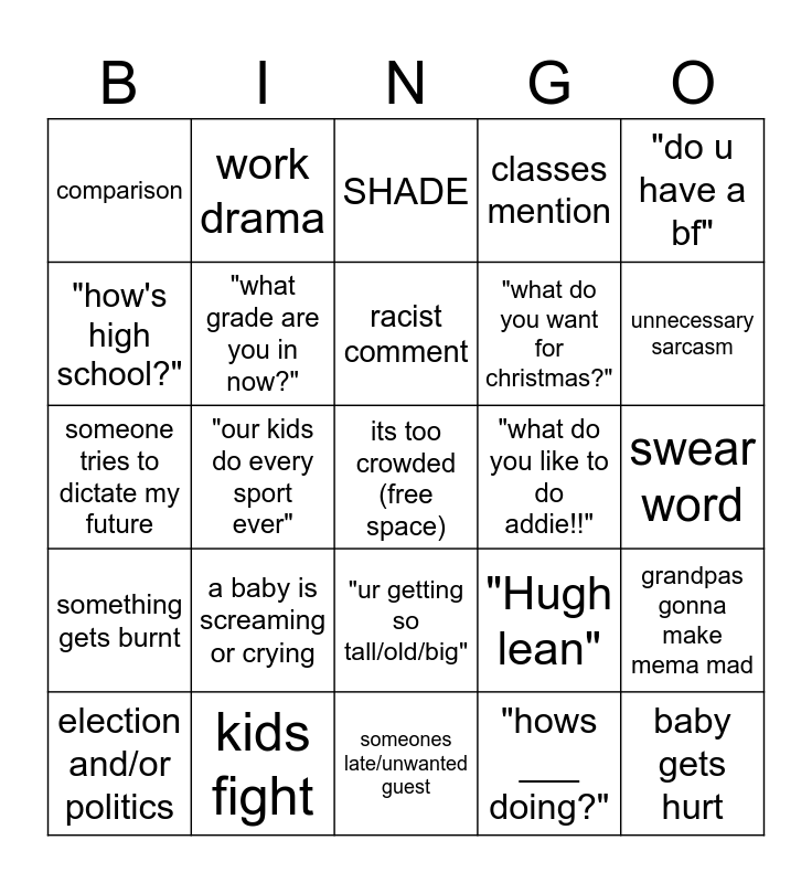 This bingo card has a free space and 24 words: a baby is screaming or crying, kids fight, racist comment, election and/or politics, "do u have a bf", comparison, "how's high school?", work drama, "what do you like to do addie!!", "ur getting so tall/old/big", "what do you want for christmas?", someone tries to dictate my future, "Hugh lean", grandpas gonna make mema mad, "what grade are you in now?", "hows ___ doing?", swear word, SHADE, unnecessary sarcasm, "our kids do every sport ever", baby gets hurt, something gets burnt, classes mention and someones late/unwanted guest.