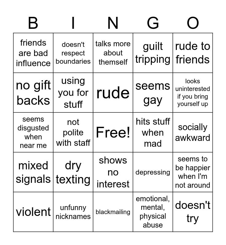 This bingo card has a free space and 24 words: dry texting, unfunny nicknames, rude, violent, rude to friends, friends are bad influence, no gift backs, doesn't respect boundaries, hits stuff when mad, shows no interest, seems gay, seems disgusted when near me, depressing, seems to be happier when I'm not around, using you for stuff, emotional, mental, physical abuse, socially awkward, talks more about themself, looks uninterested if you bring yourself up, not polite with staff, doesn't try, mixed signals, guilt tripping and blackmailing.