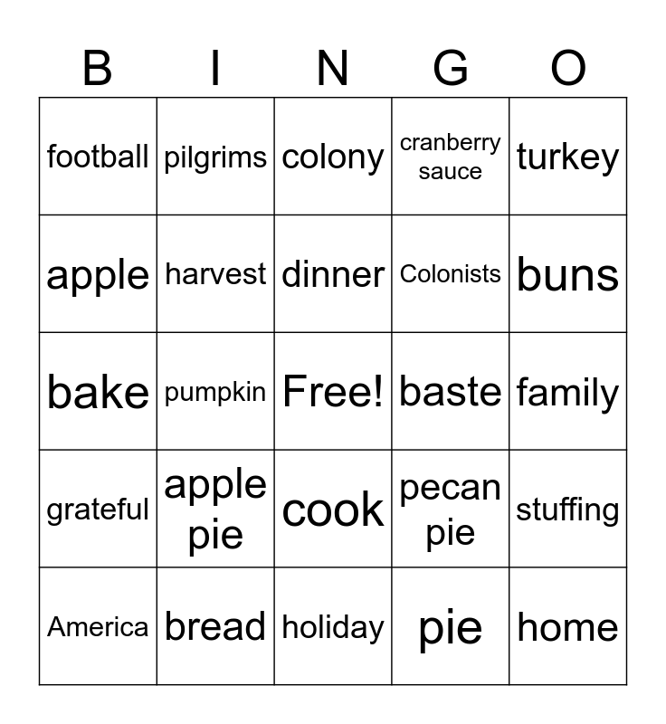 This bingo card has a free space and 34 words: family, pie, feast, celebrate, grateful, harvest, turkey, America, pilgrims, cranberries, dinner, colony, appreciation, carve, baste, buns, bread, bake, apple pie, pecan pie, cook, delicious, football, family, holiday, home, cranberry sauce, eat, Colonists, apple, autumn, pumpkin, stuffing and tradition.