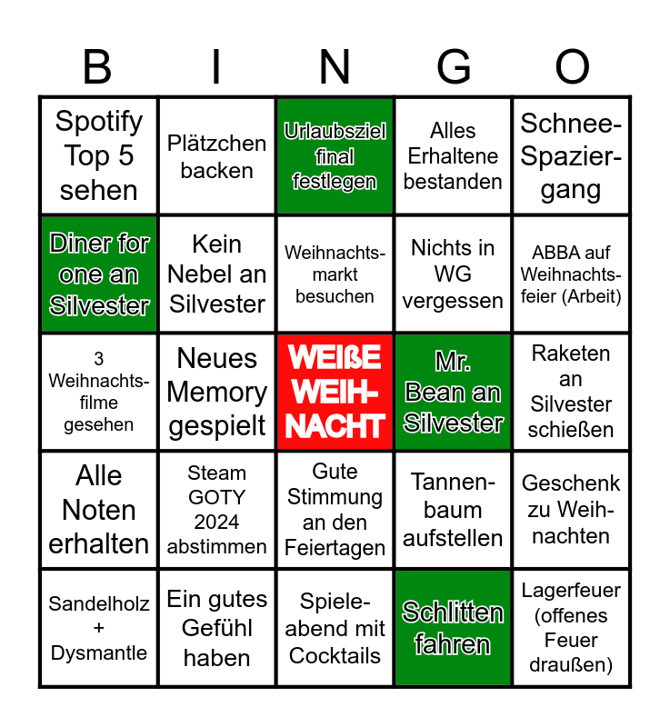 This bingo card has a free space and 24 words: Steam GOTY 2024 abstimmen, Ein gutes Gefühl haben, Weihnachts-markt besuchen, Sandelholz + Dysmantle, Schnee-Spazier-gang, Spotify Top 5 sehen, Diner for one an Silvester, Plätzchen backen, Mr. Bean an Silvester, Gute Stimmung an den Feiertagen, Nichts in WG vergessen, 3 Weihnachts-filme gesehen, Tannen-baum aufstellen, Geschenk zu Weih-nachten, Kein Nebel an Silvester, Schlitten fahren, Raketen an Silvester schießen, Urlaubsziel final festlegen, ABBA auf Weihnachts-feier (Arbeit), Neues Memory gespielt, Lagerfeuer (offenes Feuer draußen), Alle Noten erhalten, Alles Erhaltene bestanden and Spiele-abend mit Cocktails.