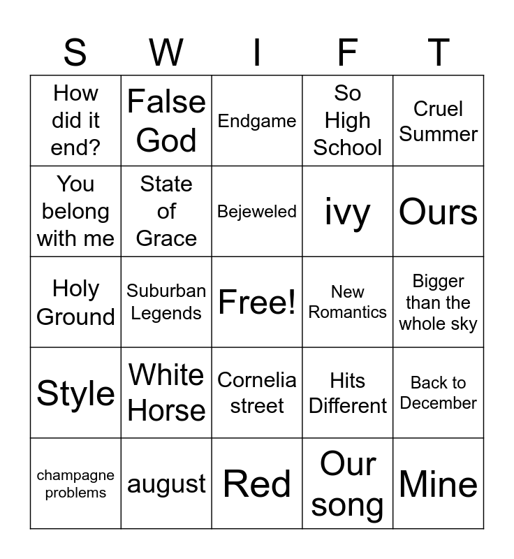 This bingo card has a free space and 24 words: White Horse, august, Bejeweled, champagne problems, Cruel Summer, How did it end?, You belong with me, False God, New Romantics, Cornelia street, ivy, Holy Ground, Hits Different, Back to December, State of Grace, Our song, Bigger than the whole sky, Endgame, Ours, Suburban Legends, Mine, Style, So High School and Red.