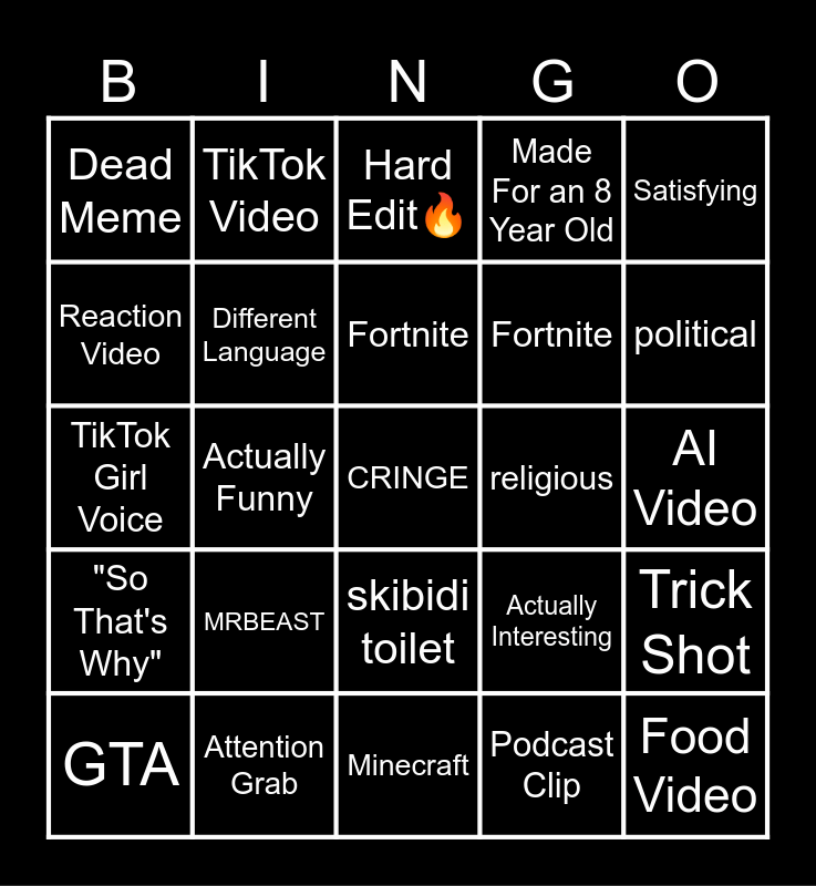 This bingo card has a free space and 24 words: MRBEAST, Attention Grab, Fortnite, GTA, Satisfying, Dead Meme, Reaction Video, TikTok Video, religious, skibidi toilet, Fortnite, TikTok Girl Voice, Actually Interesting, Trick Shot, Different Language, Podcast Clip, AI Video, Hard Edit🔥, political, Actually Funny, Food Video, "So That's Why", Made For an 8 Year Old and Minecraft.