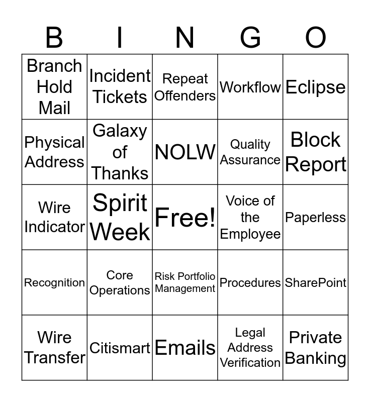 This bingo card has a free space and 26 words: Risk Portfolio Management, Legal Address Verification, NOLW, Citismart, Eclipse, Branch Hold Mail, Physical Address, Incident Tickets, Paperless, Procedures, Quality Assurance, Wire Indicator, SharePoint, Wire Transfer, Spirit Week, Teamwork, Workflow, Recognition, Repeat Offenders, Private Banking, Block Report, Emails, Voice of the Employee, Core Operations, Galaxy of Thanks and Star Player.
