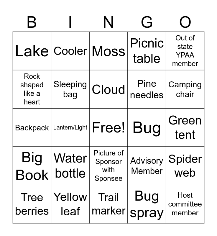 This bingo card has a free space and 30 words: Yellow leaf, Pine cone, Lantern/Light, Flower, Lake, Moss, Sleeping bag, Picture of Sponsor with Sponsee, Bug, Trail marker, Green tent, Host committee member, Bug spray, Firewood, Camping chair, Wildlife (mammal), Advisory Member, Big Book, Water bottle, Out of state YPAA member, Backpack, Mushroom, Cooler, Pine needles, Rock shaped like a heart, Picnic table, Spider web, Tree berries, Cloud and Acorn.