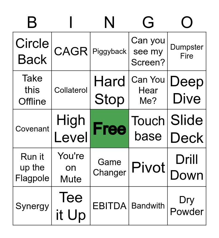 This bingo card has a free space and 24 words: You're on Mute, Tee it Up, Hard Stop, Synergy, Dumpster Fire, Circle Back, Take this Offline, CAGR, Touch base, Game Changer, Can You Hear Me?, Covenant, Pivot, Drill Down, Collaterol, Bandwith, Slide Deck, Piggyback, Deep Dive, High Level, Dry Powder, Run it up the Flagpole, Can you see my Screen? and EBITDA.