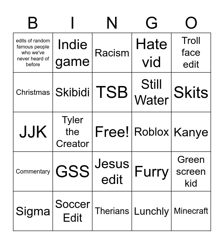 This bingo card has a free space and 24 words: GSS, Soccer Edit, TSB, Sigma, Troll face edit, edits of random famous people who we've never heard of before, Christmas, Indie game, Roblox, Jesus edit, Still Water, JJK, Furry, Green screen kid, Skibidi, Lunchly, Kanye, Racism, Skits, Tyler the Creator, Minecraft, Commentary, Hate vid and Therians.