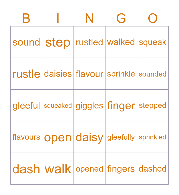 This bingo card has a free space and 24 words: open, walk, flavour, dash, squeak, sound, rustle, step, finger, daisy, sprinkle, gleeful, gleefully, sprinkled, daisies, fingers, stepped, rustled, sounded, squeaked, dashed, flavours, walked and opened.