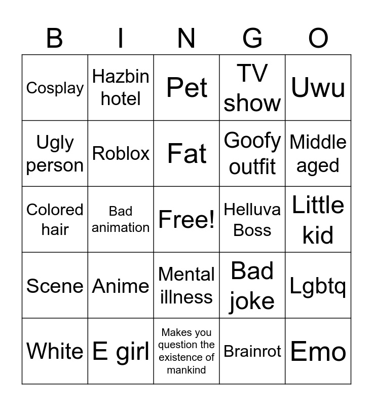 This bingo card has a free space and 24 words: Anime, E girl, Fat, White, Uwu, Cosplay, Ugly person, Hazbin hotel, Helluva Boss, Mental illness, Goofy outfit, Colored hair, Bad joke, Lgbtq, Roblox, Brainrot, Little kid, Pet, Middle aged, Bad animation, Emo, Scene, TV show and Makes you question the existence of mankind.