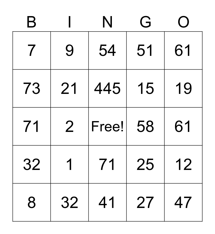 This bingo card has a free space and 24 words: 1, 32, 445, 8, 61, 7, 73, 9, 58, 71, 15, 71, 25, 12, 21, 27, 61, 54, 19, 2, 47, 32, 51 and 41.