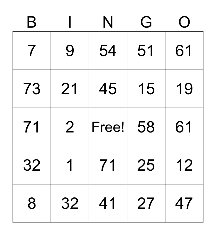 This bingo card has a free space and 24 words: 1, 32, 45, 8, 61, 7, 73, 9, 58, 71, 15, 71, 25, 12, 21, 27, 61, 54, 19, 2, 47, 32, 51 and 41.