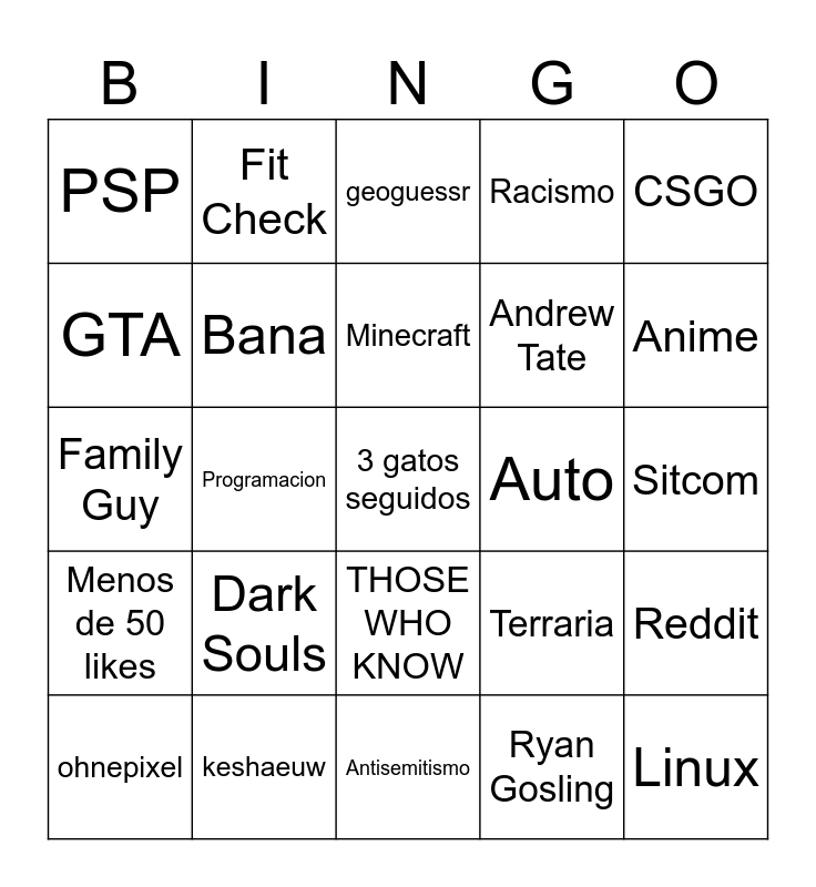 This bingo card has a free space and 24 words: Dark Souls, keshaeuw, Minecraft, ohnepixel, CSGO, PSP, GTA, Fit Check, Auto, THOSE WHO KNOW, Andrew Tate, Family Guy, Terraria, Reddit, Bana, Ryan Gosling, Sitcom, geoguessr, Anime, Programacion, Linux, Menos de 50 likes, Racismo and Antisemitismo.