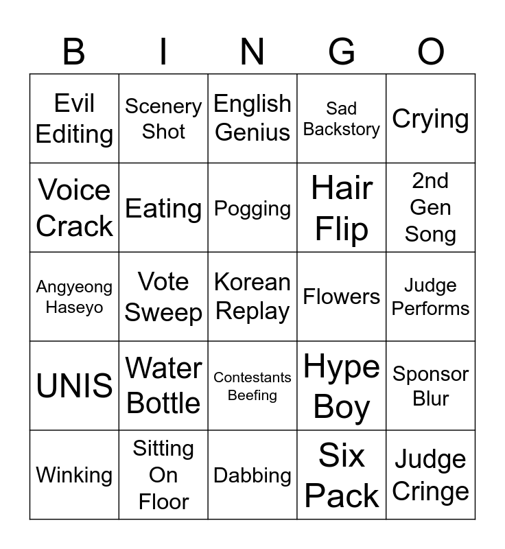 This bingo card has a free space and 24 words: Water Bottle, Sitting On Floor, Pogging, Winking, Crying, Evil Editing, Voice Crack, Scenery Shot, Flowers, Contestants Beefing, Hair Flip, Angyeong Haseyo, Hype Boy, Sponsor Blur, Eating, Six Pack, Judge Performs, English Genius, 2nd Gen Song, Vote Sweep, Judge Cringe, UNIS, Sad Backstory and Dabbing.
