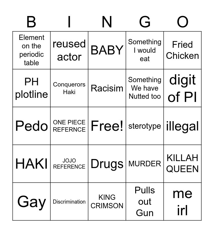 This bingo card has a free space and 24 words: JOJO REFERENCE, Discrimination, Racisim, Gay, Fried Chicken, Element on the periodic table, PH plotline, reused actor, sterotype, Drugs, Something We have Nutted too, Pedo, MURDER, KILLAH QUEEN, Conquerors Haki, Pulls out Gun, illegal, BABY, digit of PI, ONE PIECE REFERNCE, me irl, HAKI, Something I would eat and KING CRIMSON.