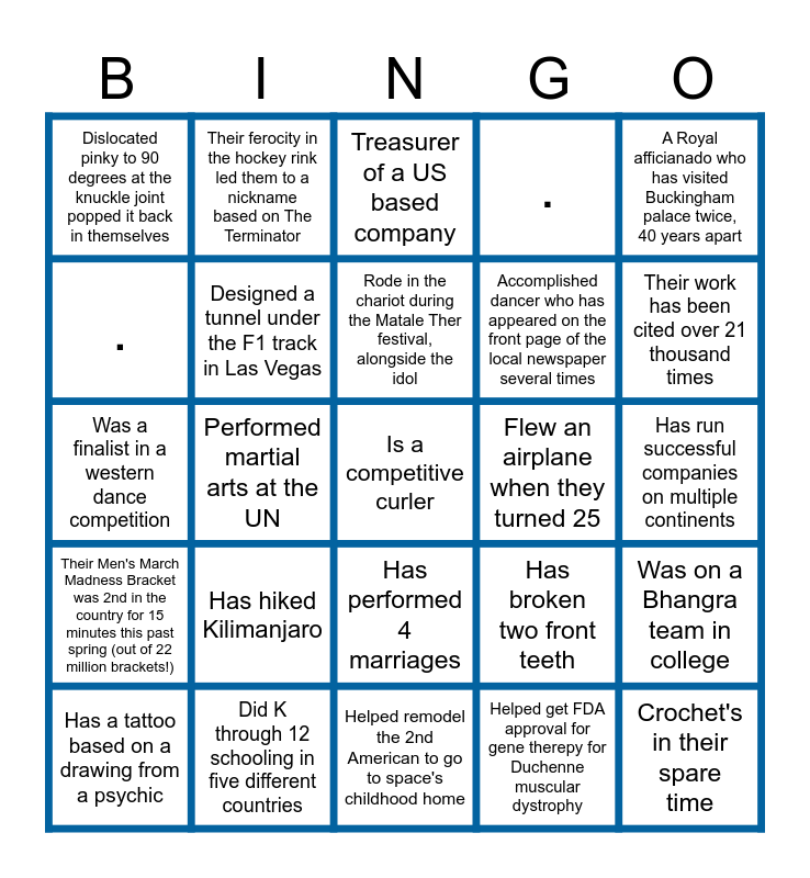 This bingo card has 32 words: Helped get FDA approval for gene therepy for Duchenne muscular dystrophy, Was asked to run for their local city council, Performed martial arts at the UN, A former NCAA track athelete and still holds 4 records at their alma mater, Their Men's March Madness Bracket was 2nd in the country for 15 minutes this past spring (out of 22 million brackets!), Designed a tunnel under the F1 track in Las Vegas, A Royal afficianado who has visited Buckingham palace twice, 40 years apart, Was on a Bhangra team in college, Their ferocity in the hockey rink led them to a nickname based on The Terminator, Crochet's in their spare time, Rode in the chariot during the Matale Ther festival, alongside the idol, Treasurer of a US based company, Consulted for an F1 team, Is a professional balloon arch maker, Flew an airplane when they turned 25, Was in a street fight in Kazakhstan, Has a tattoo based on a drawing from a psychic, Was a finalist in a western dance competition, Has performed 4 marriages, Has hiked Kilimanjaro, Has broken two front teeth, Has recorded two solo music albums, Has run successful companies on multiple continents, Did K through 12 schooling in five different countries, Is a competitive curler, ., Accomplished dancer who has appeared on the front page of the local newspaper several times, ., Dislocated pinky to 90 degrees at the knuckle joint popped it back in themselves, Helped remodel the 2nd American to go to space's childhood home, Has been invited to tea with the Queen at Buckingham Palace and Their work has been cited over 21 thousand times.