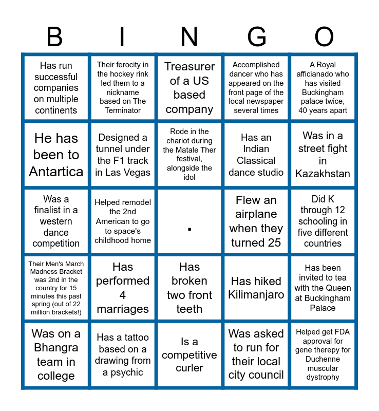 This bingo card has 34 words: Helped get FDA approval for gene therepy for Duchenne muscular dystrophy, Was asked to run for their local city council, Performed martial arts at the UN, A former NCAA track athelete and still holds 4 records at their alma mater, Their Men's March Madness Bracket was 2nd in the country for 15 minutes this past spring (out of 22 million brackets!), Designed a tunnel under the F1 track in Las Vegas, A Royal afficianado who has visited Buckingham palace twice, 40 years apart, Was on a Bhangra team in college, Their ferocity in the hockey rink led them to a nickname based on The Terminator, Crochet's in their spare time, Rode in the chariot during the Matale Ther festival, alongside the idol, Treasurer of a US based company, Consulted for an F1 team, Is a professional balloon arch maker, Flew an airplane when they turned 25, Was in a street fight in Kazakhstan, Has a tattoo based on a drawing from a psychic, Was a finalist in a western dance competition, Has performed 4 marriages, Has hiked Kilimanjaro, Has broken two front teeth, Has recorded two solo music albums, Has run successful companies on multiple continents, Did K through 12 schooling in five different countries, Is a competitive curler, ., Accomplished dancer who has appeared on the front page of the local newspaper several times, ., Has an Indian Classical dance studio, He has been to Antartica, Dislocated pinky to 90 degrees at the knuckle joint popped it back in themselves, Helped remodel the 2nd American to go to space's childhood home, Has been invited to tea with the Queen at Buckingham Palace and Their work has been cited over 21 thousand times.
