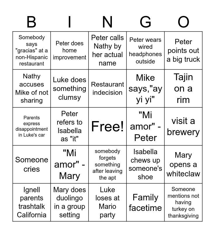 This bingo card has a free space and 24 words: "Mi amor" - Mary, Mary does duolingo in a group setting, Restaurant indecision, Ignell parents trashtalk California, Peter points out a big truck, Somebody says "gracias" at a non-Hispanic restaurant, Nathy accuses Mike of not sharing, Peter does home improvement, "Mi amor" - Peter, somebody forgets something after leaving the apt, Mike says,"ay yi yi", Parents express disappointment in Luke's car, Isabella chews up someone's shoe, Mary opens a whiteclaw, Luke does something clumsy, Family facetime, visit a brewery, Peter calls Nathy by her actual name, Tajin on a rim, Peter refers to Isabella as "it", Someone mentions not having turkey on thanksgiving, Someone cries, Peter wears wired headphones outside and Luke loses at Mario party.