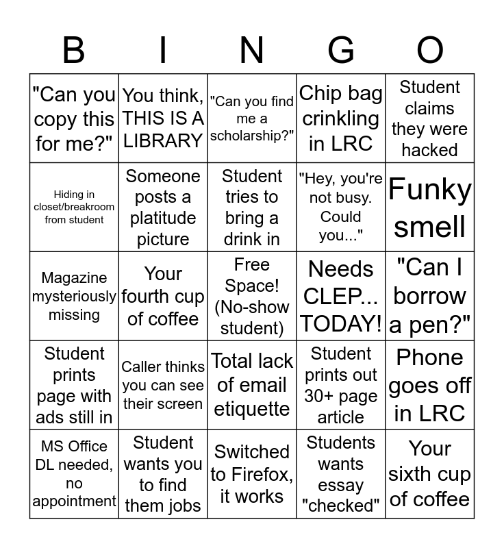 This bingo card has a free space and 24 words: Caller thinks you can see their screen, Student wants you to find them jobs, Student tries to bring a drink in, MS Office DL needed, no appointment, Student claims they were hacked, "Can you copy this for me?", Hiding in closet/breakroom from student, You think, THIS IS A LIBRARY, Needs CLEP... TODAY!, Total lack of email etiquette, "Hey, you're not busy. Could you...", Magazine mysteriously missing, Student prints out 30+ page article, Phone goes off in LRC, Someone posts a platitude picture, Students wants essay "checked", "Can I borrow a pen?", "Can you find me a scholarship?", Funky smell, Your fourth cup of coffee, Your sixth cup of coffee, Student prints page with ads still in, Chip bag crinkling in LRC and Switched to Firefox, it works.