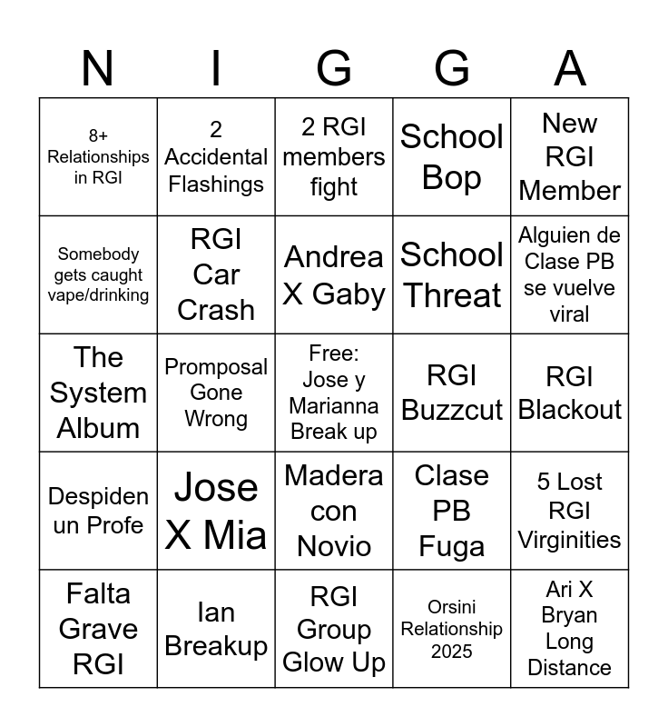 This bingo card has a free space and 24 words: Jose X Mia, Ian Breakup, Andrea X Gaby, Falta Grave RGI, New RGI Member, 8+ Relationships in RGI, Somebody gets caught vape/drinking, 2 Accidental Flashings, RGI Buzzcut, Madera con Novio, School Threat, The System Album, Clase PB Fuga, 5 Lost RGI Virginities, RGI Car Crash, Orsini Relationship 2025, RGI Blackout, 2 RGI members fight, Alguien de Clase PB se vuelve viral, Promposal Gone Wrong, Ari X Bryan Long Distance, Despiden un Profe, School Bop and RGI Group Glow Up.