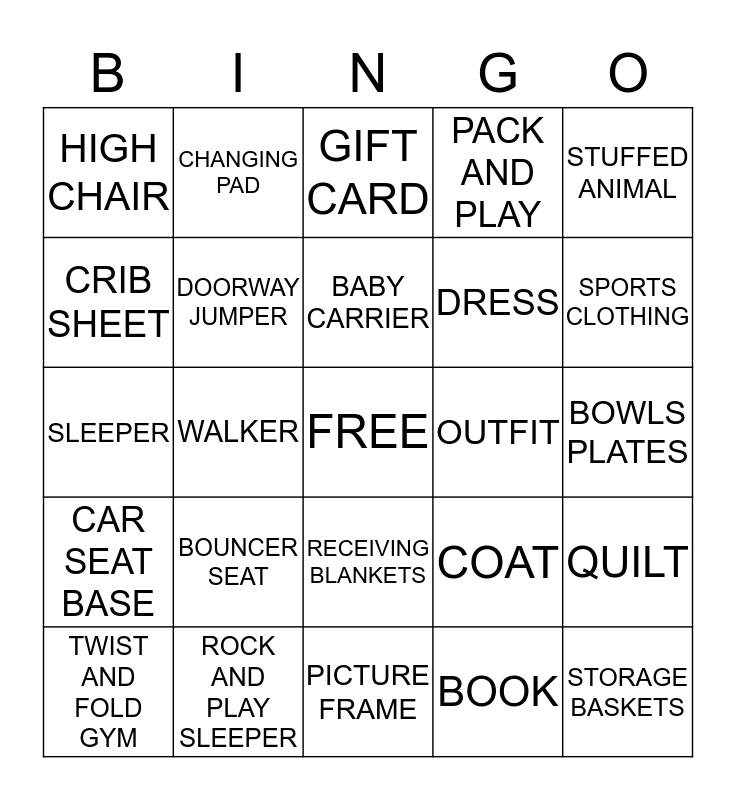 This bingo card has a free space and 24 words: BOUNCER SEAT, ROCK AND PLAY SLEEPER, BABY CARRIER, TWIST AND FOLD GYM, STUFFED ANIMAL, HIGH CHAIR, CRIB SHEET, CHANGING PAD, OUTFIT, RECEIVING BLANKETS, DRESS, SLEEPER, COAT, QUILT, DOORWAY JUMPER, BOOK, BOWLS PLATES, GIFT CARD, SPORTS CLOTHING, WALKER, STORAGE BASKETS, CAR SEAT BASE, PACK AND PLAY and PICTURE FRAME.