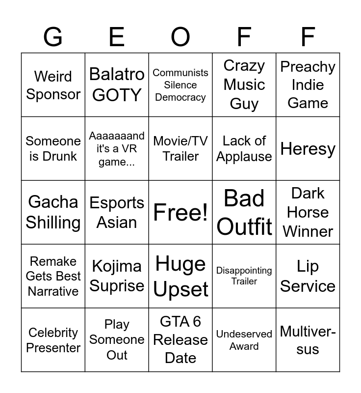 This bingo card has a free space and 24 words: Kojima Suprise, Play Someone Out, Movie/TV Trailer, Celebrity Presenter, Preachy Indie Game, Weird Sponsor, Someone is Drunk, Balatro GOTY, Bad Outfit, Huge Upset, Lack of Applause, Gacha Shilling, Disappointing Trailer, Lip Service, Aaaaaaand it's a VR game..., Undeserved Award, Dark Horse Winner, Communists Silence Democracy, Heresy, Esports Asian, Multiver-sus, Remake Gets Best Narrative, Crazy Music Guy and GTA 6 Release Date.