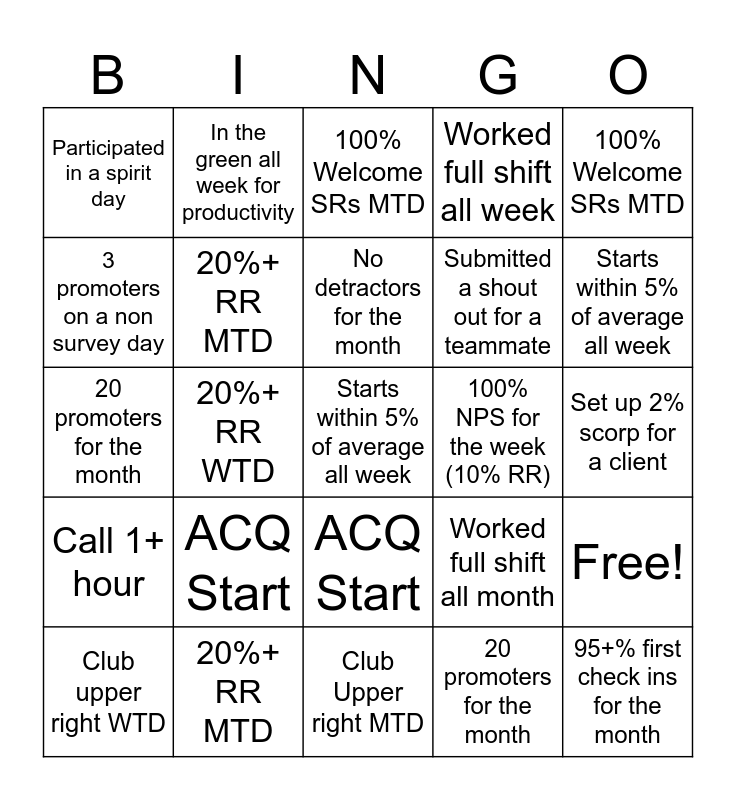 This bingo card has 48 words: Calls within 5% of average all week, Starts within 5% of average all week, Club upper right WTD, Club Upper right MTD, ACQ Start, Call 1+ hour, In the green all week for productivity, 5 promoters in 1 day, 3 promoters on a non survey day, 10 promoters for the week, 20%+ RR MTD, Worked full shift all week, Free!, Worked full shift all month, Set up 2% scorp for a client, Earned a badge, No detractors for the month, 100% NPS for the week (10% RR), 95+% first check ins for the month, 100% Welcome SRs MTD, 20%+ RR WTD, 20 promoters for the month, Participated in a spirit day, Submitted a shout out for a teammate, Calls within 5% of average all week, Starts within 5% of average all week, Club upper right WTD, Club Upper right MTD, ACQ Start, Call 1+ hour, In the green all week for productivity, 5 promoters in 1 day, 3 promoters on a non survey day, 10 promoters for the week, 20%+ RR MTD, Worked full shift all week, Worked full shift all month, Set up 2% scorp for a client, Earned a badge, No detractors for the month, 100% NPS for the week (10% RR), 95+% first check ins for the month, 100% Welcome SRs MTD, 20%+ RR WTD, 20 promoters for the month, Participated in a spirit day, Submitted a shout out for a teammate and 2nd check ins 80%+.