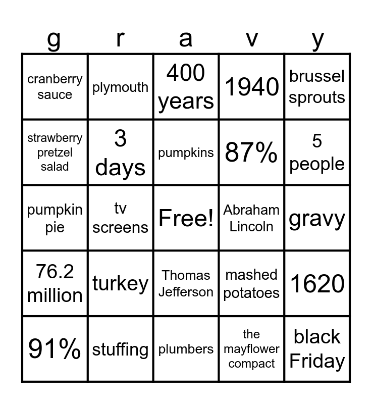 This bingo card has a free space and 24 words: turkey, stuffing, pumpkins, 91%, brussel sprouts, cranberry sauce, strawberry pretzel salad, plymouth, Abraham Lincoln, Thomas Jefferson, 87%, pumpkin pie, mashed potatoes, 1620, 3 days, the mayflower compact, gravy, 400 years, 5 people, tv screens, black Friday, 76.2 million, 1940 and plumbers.
