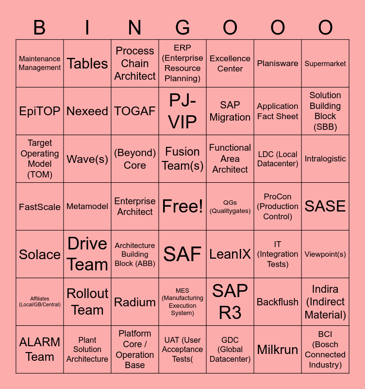 This bingo card has a free space and 56 words: Milkrun, Intralogistic, Shopfloor Management, Maintenance Management, Metamodel, Radium, Supermarket, Packaging & Confirmation, Nexeed, MES (Manufacturing Execution System), ERP (Enterprise Resource Planning), Affiliates (Local/GB/Central), Solace, SASE, Plant Solution Architecture, Drive Team, Excellence Center, SAP Migration, Value Stream, Application Fact Sheet, Solution Building Block (SBB), Architecture Building Block (ABB), Functional Area Architect, Process Chain Architect, Infrastructure Architect, EpiTOP, ProCon (Production Control), IT Landscape, TOGAF, SAF, Archimate, Viewpoint(s), ALARM Team, Platform Core / Operation Base, Target Operating Model (TOM), Planisware, PJ-VIP, Rollout Team, Wave(s), Tables, Fusion Team(s), BCI (Bosch Connected Industry), SAP R3, SAP S4 (Hana), Indira (Indirect Material), (Beyond) Core, FastScale, UAT (User Acceptance Tests(, IT (Integration Tests), QGs (Qualitygates), Enterprise Architect, LeanIX, Backflush, GDC (Global Datacenter), LDC (Local Datacenter) and Line.