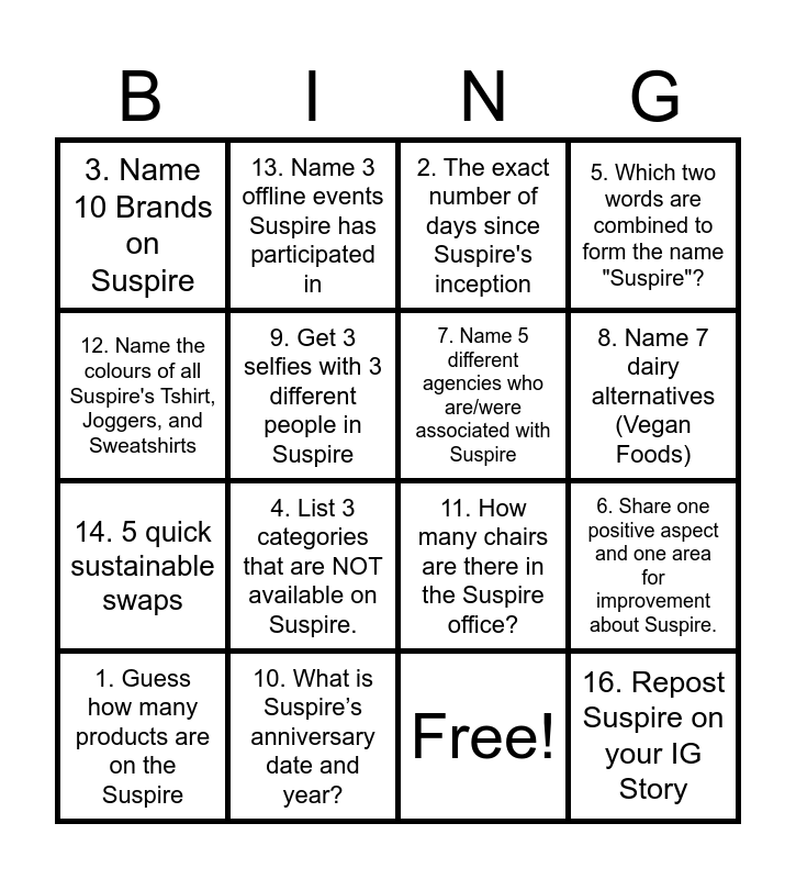 This bingo card has 17 words: Free!, 1. Guess how many products are on the Suspire, 2. The exact number of days since Suspire's inception, 3. Name 10 Brands on Suspire, 4. List 3 categories that are NOT available on Suspire., 5. Which two words are combined to form the name "Suspire"?, 6. Share one positive aspect and one area for improvement about Suspire., 7. Name 5 different agencies who are/were associated with Suspire, 8. Name 7 dairy alternatives (Vegan Foods), 9. Get 3 selfies with 3 different people in Suspire, 10. What is Suspire’s anniversary date and year?, 11. How many chairs are there in the Suspire office?, 12. Name the colours of all Suspire's Tshirt, Joggers, and Sweatshirts, 13. Name 3 offline events Suspire has participated in, 14. 5 quick sustainable swaps, 15. How many followers does Suspire have on Instagram and 16. Repost Suspire on your IG Story.