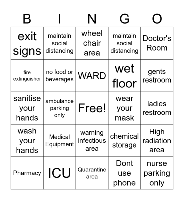 This bingo card has a free space and 24 words: Medical Equipment, ICU, WARD, Pharmacy, Doctor's Room, exit signs, fire extinguisher, maintain social distancing, wear your mask, warning infectious area, wet floor, sanitise your hands, chemical storage, High radiation area, no food or beverages, Dont use phone, ladies restroom, wheel chair area, gents restroom, ambulance parking only, nurse parking only, wash your hands, maintain social distancing and Quarantine area.