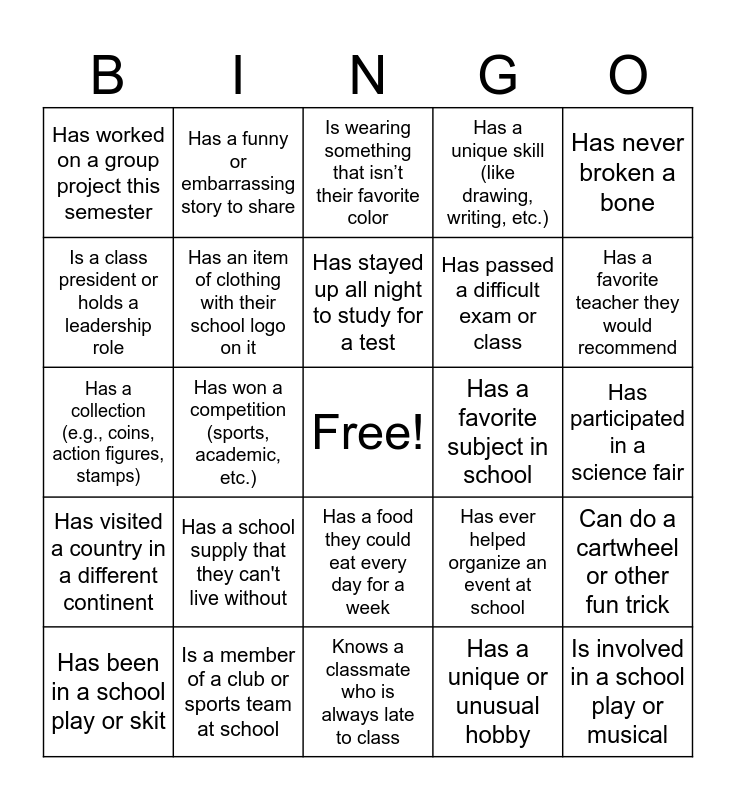 This bingo card has a free space and 39 words: Has a pet, Has an Instagram or TikTok account, Has seen every movie in a movie franchise (e.g., Marvel, Harry Potter), Has an item of clothing with their school logo on it, Has been in a school play or skit, Has a food they could eat every day for a week, Has stayed up all night to study for a test, Has a collection of something unusual (e.g., stamps, postcards), Has never broken a bone, Has visited a country in a different continent, Has won a competition (sports, academic, etc.), Has a unique skill (like drawing, writing, etc.), Is involved in a school play or musical, Has participated in a science fair, Has a favorite subject in school, Has a school supply that they can't live without, Has participated in a sports competition at school, Has worked on a group project this semester, Has an after-school job or internship, Has ever helped organize an event at school, Is a class president or holds a leadership role, Knows a classmate who is always late to class, Has passed a difficult exam or class, Has a favorite teacher they would recommend, Is a morning person (wakes up early), Has a favorite color that is not blue or red, Is left-handed, Has a sibling who is the same age as them, Has the same first name as a famous person, Has a funny or embarrassing story to share, Is an only child, Has a nickname that isn’t their real name, Is wearing something that isn’t their favorite color, Is a member of a club or sports team at school, Has a unique or unusual hobby, Has a hidden talent (like singing, dancing, etc.), Can do a cartwheel or other fun trick, Has a collection (e.g., coins, action figures, stamps) and Has ever won an award or trophy for something.
